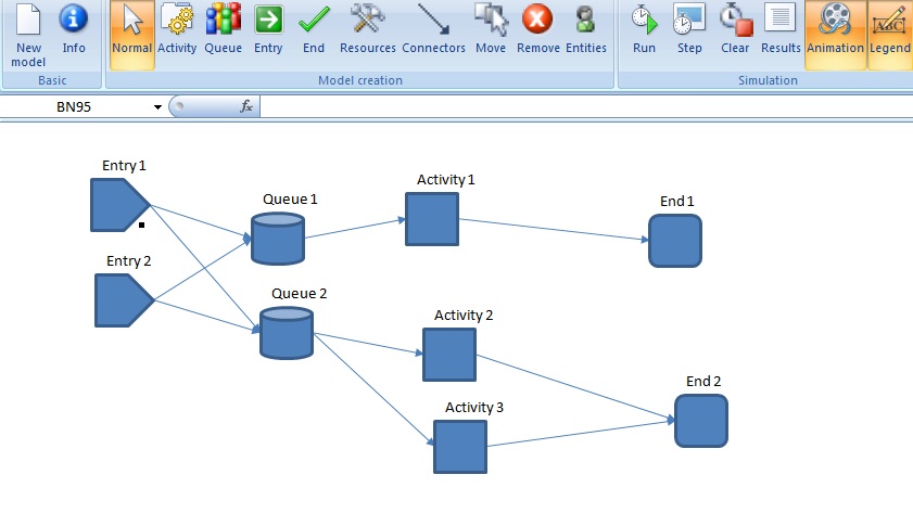 - Select model element and place them to the model by clicking on model background. Supported elements are Entries, Queues, Activities and Ends